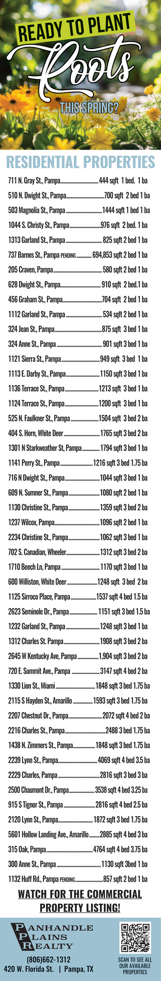 Feb 23, 2026. Panhandle Plains Realty Real Estate Ads from The Pampa News