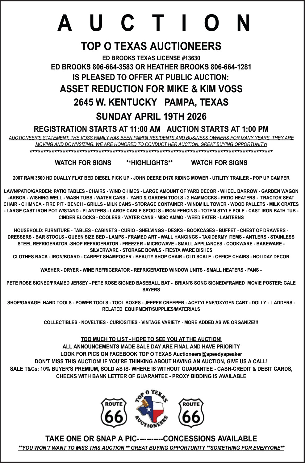 Apr 20, 2026. Top O Texas Auctioneers Auction Ads from The Pampa News