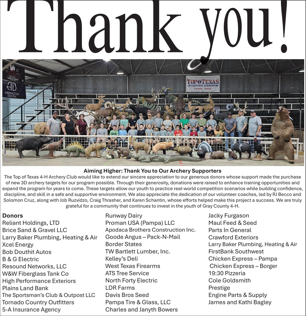 Apr 20, 2026. Top of Texas 4-H Archery Club Misc Ads from The Pampa News